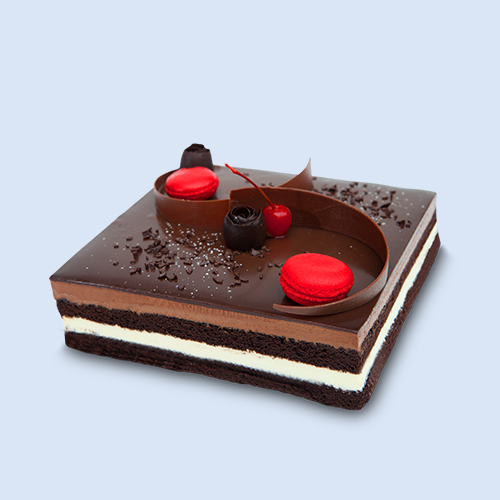 Dark and white chocolate mousse with soft layers of sponge .