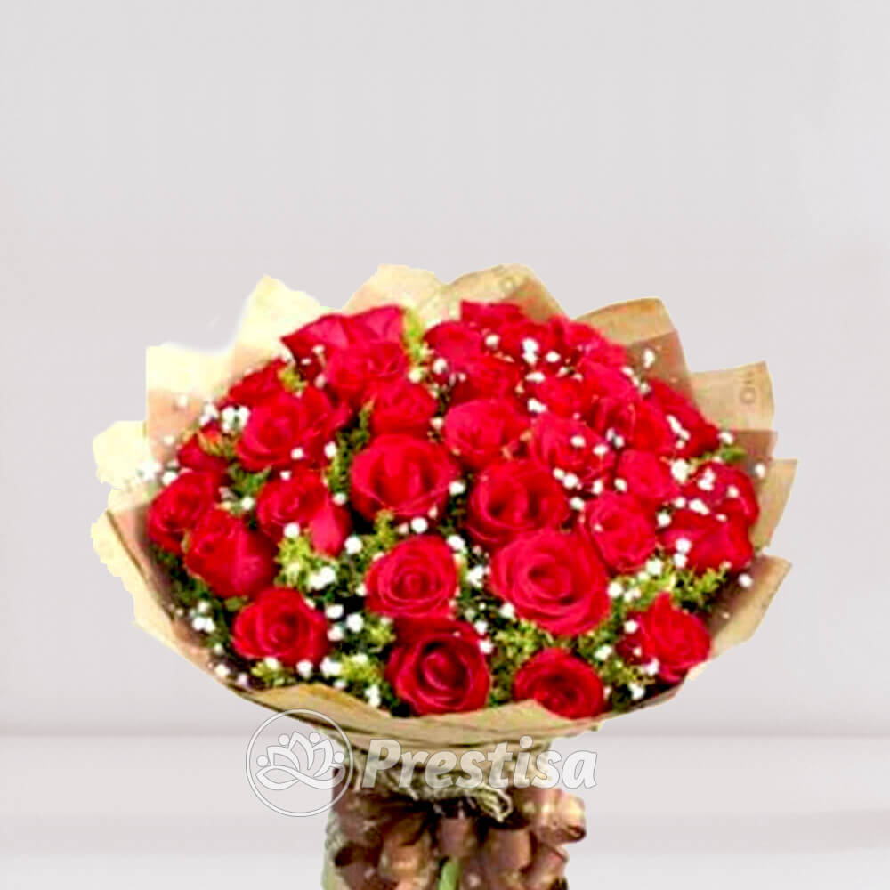 What’s inside : 30 tangkai bunga mawar merah, baby breath. Warna dan jenis wrapping menyesuaikan ketersediaan di toko bunga.
