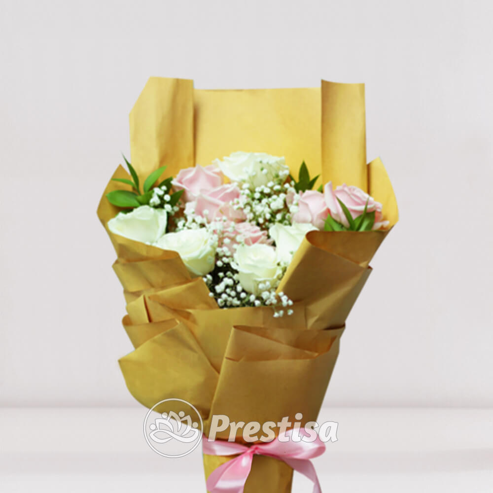 What’s inside : 15 tangkai bunga mawar putih-peach, baby breath. Jenis dan warna wrapping menyesuaikan ketersediaan di toko.