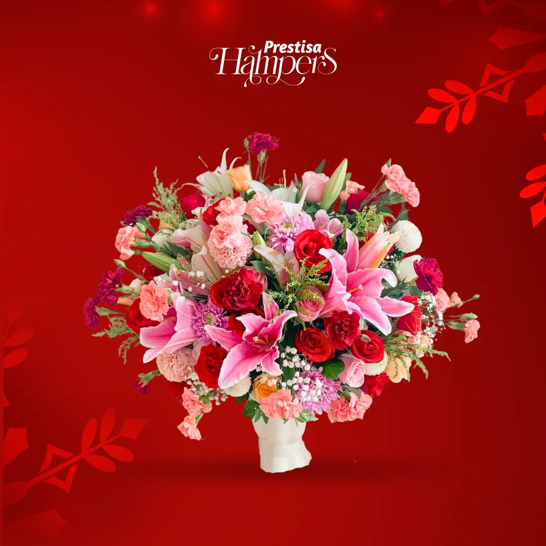 Table flower arranged to bright up your room. This beautiful arrangement consist of gerbera flowers, roses, and lily