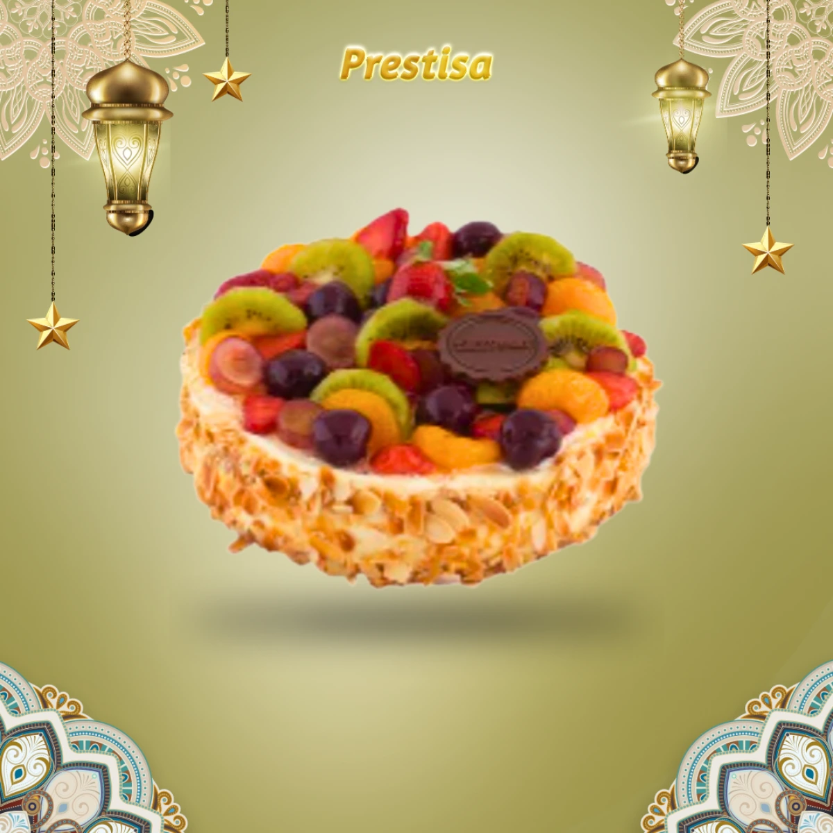 Kelezatan krim vanila di antara sponge cake vanila, dengan topping berbagai potongan buah. Ukuran cake D20