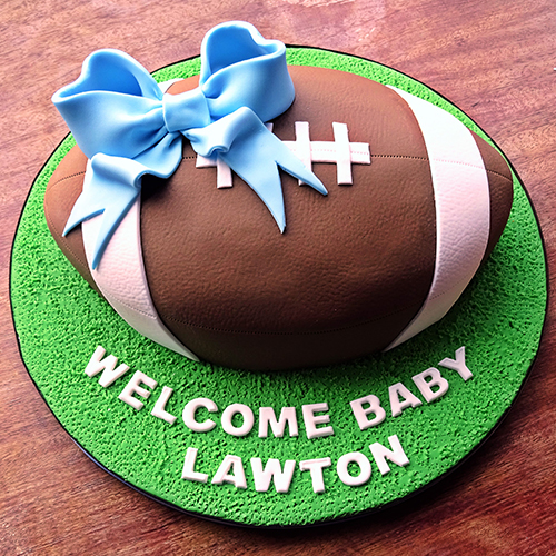 - Dilapisi dengan Fondant Icing berbentuk bola rugby dan hiasan pita