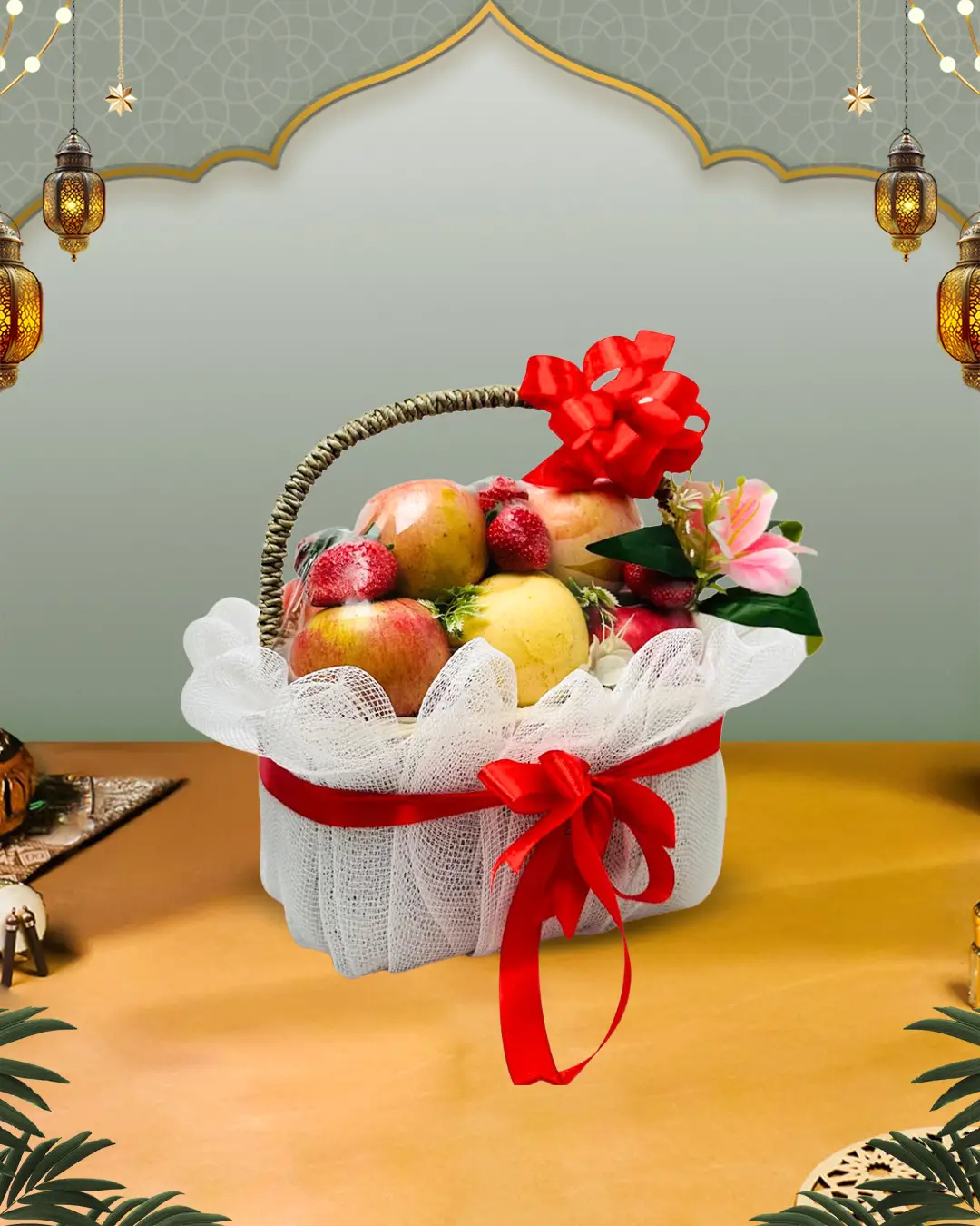 “Parsel Buah Segar “”Fruity Happiness”” dikemas rapi dalam keranjang rotan cantik, dibalut kain tile dan dihiasi pita dekoratif, parsel ini cocok sebagai hadiah ulang tahun, menjenguk kerabat sakit, ucapan selamat, maupun hadiah di acara lain.