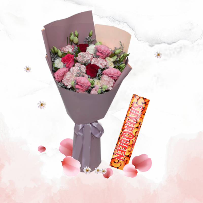 - Paket berisi Chocolate Bar dan Hand Bouquet berisi pink carnation dan rose