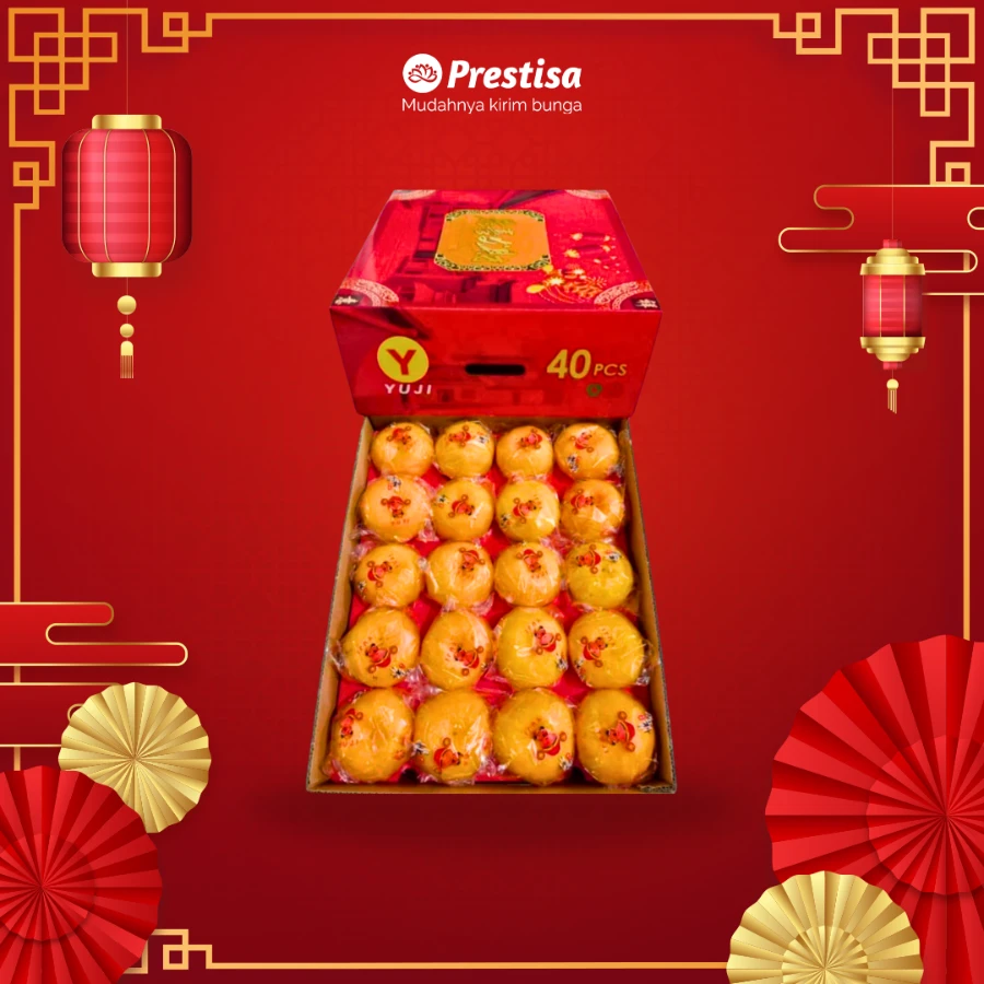 Parcel Buah isi 20 jeruk ponkam fresh yang dihiasi dengan ornamen imlek warna merah
