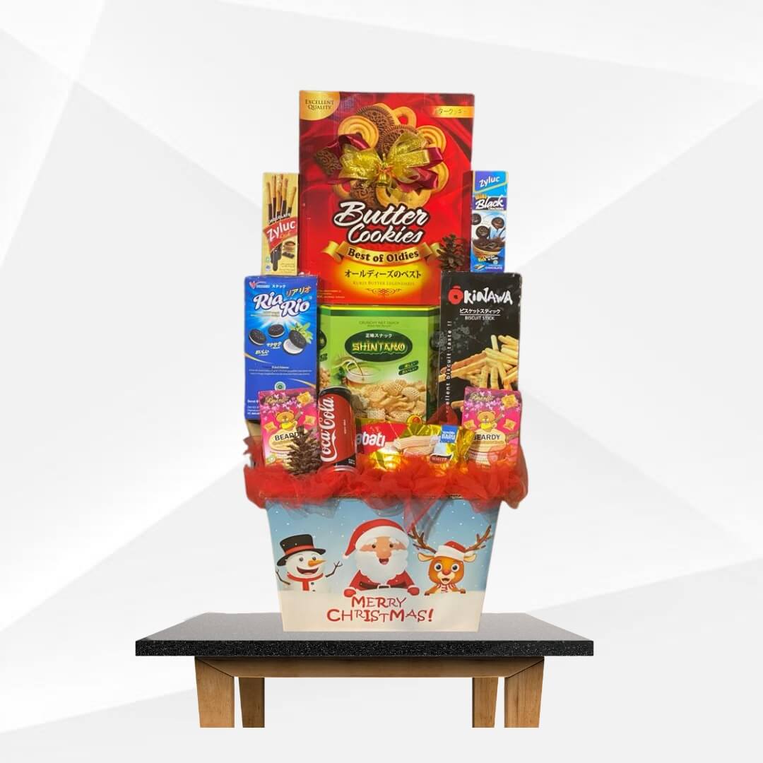 Terdiri dari Butter Cookies, Snack Shintaro, Nabati Wafer, Coca Cola, Beardy, Ria Rio Biskuit, Zyluc Cookies, Zyluc Chocolate, Sagu Keju, Snack Okinawa, dan Ornamen Natal (Isi Parcel dapat berubah sesuai stok yang ada)