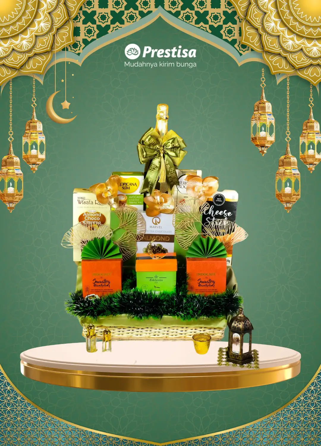 Parcel Signature Lebaran yang berisi: – J&W Celebration Apple Sparkling Drink 750ml – Tropicana Slim Avocado Coffee 4x14gr – Fererro Rocher Chocolate Bar Weiss 18gr – Cheese Stick Edam Ren Angel – Wisata Rasa Almond Choco Cheese – Marvel Greentea Choco Almond 90gr – Indocafe Drip Coffee Sumatra – Edelweiss Green Tea 100gr – Keranjang Premium – Dekorasi dan Aksesoris Lebaran *noted: merek makanan sesuai dengan ketersediaan Motif parsel bertema Lebaran, mohon info sales untuk ketersediaan stok. Harga belum termasuk ongkos kirim. Pengiriman untuk Daerah Jakarta, Bogor, Depok, Tangerang, Bekasi. Mohon konfirmasi kepada sales terlebih dahulu untuk ketersediaan stok barang. Order Min H-1. Untuk pemesanan custom mohon diinfokan kepada tim sales