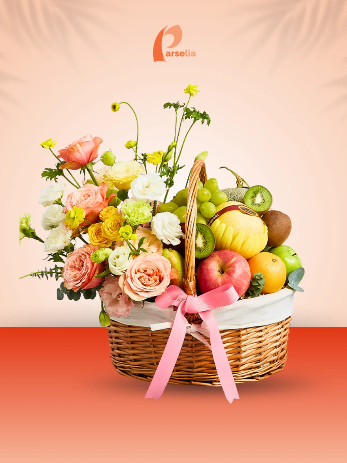 Parsel Buah Segar “Pinkies Freshness Rattan” dikemas rapi dalam keranjang rotan, dibalut plastik wrap, dihiasi pita dekoratif dan bunga, parsel ini cocok sebagai hampers hari raya (idul fitri, natal, chinese new year), menjenguk kerabat sakit, ucapan selamat, maupun hadiah di acara lain.