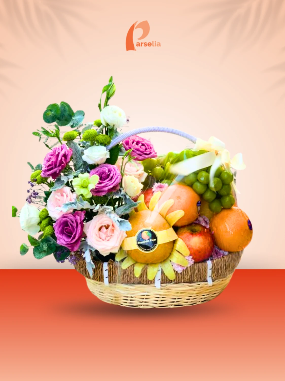 Parsel Buah Segar “Rustic Bloom Basket” dikemas rapi dalam keranjang rotan, dibalut plastik wrap. dihiasi pita dekoratif dan bunga, parsel ini cocok sebagai hampers hari raya (idul fitri, natal, chinese new year), menjenguk kerabat sakit, ucapan selamat, maupun hadiah di acara lain.